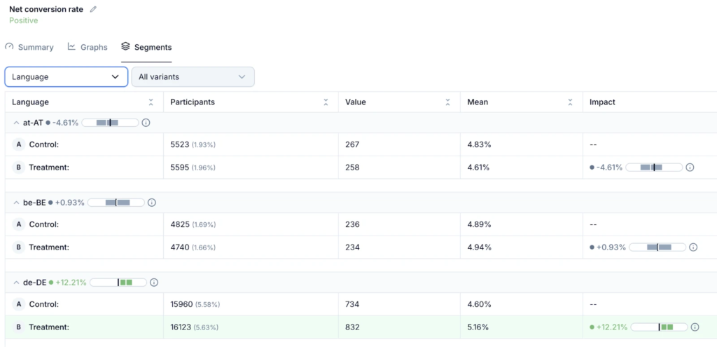 One of the most powerful features of modern experimentation platforms is the ability to explore many metrics across any number of dimensions like country, browser, device, environment, language, etc. With just a few clicks, users can segment results deeply and discover hidden differences.