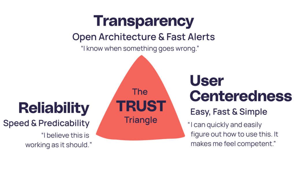 Believe it or not, we build relationships with software in the same way. When your team logs into your testing platform, they subconsciously run it through “The Trust Triangle”—but with a twist. Here’s how “The Trust Triangle” updates when people assess a platform’s trustworthiness (instead of a person’s)…